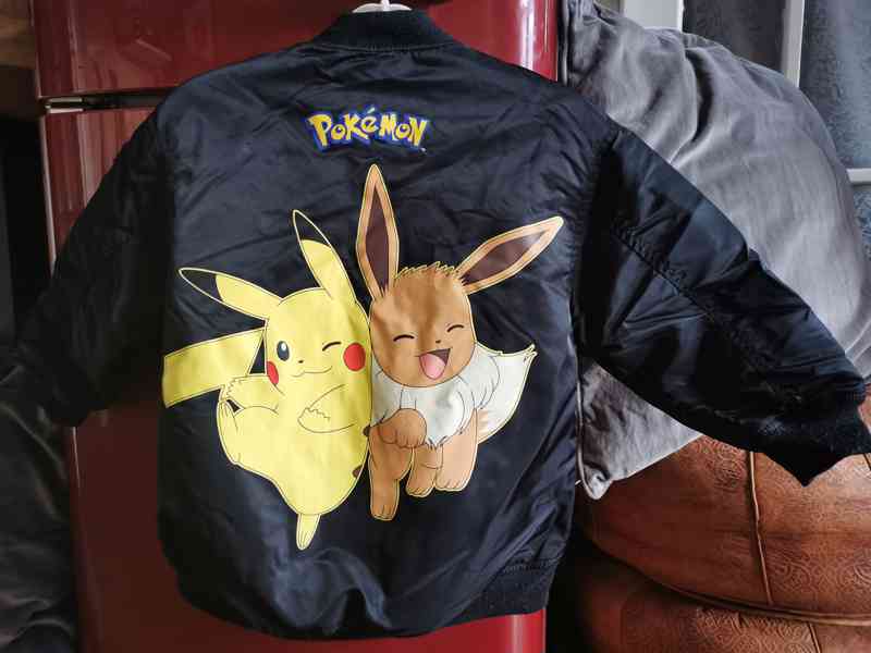 Černá Pokémon bunda bomber značky Reserved, vel. 122, nošená, v zachovalém stavu, bez děr.