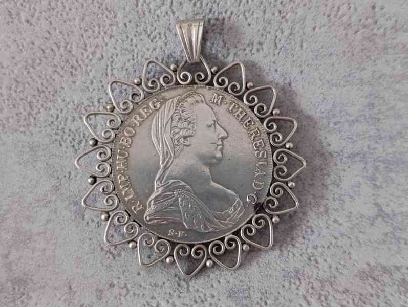 Velká stříbrná mince - tolar Marie Terezie(ZŘEJMĚ NOVORAŽBA) zasazený do stříbrného-krásně zdobeného rámečku.