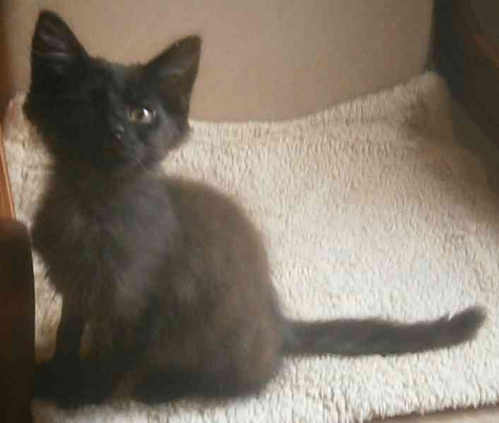 Černý, dlouhosrstý, klidnější 2,5-3měsíční Šimon umí i dovádět, je zvyklý na kotěcí přítomnost. Rád by měl v novém domově parťáka, pro hru, kočkování. Nebo rodinu, kde by měli čas a chuť se kocourkovi věnovat. A aby nebyl dlouho sám doma, je ještě malé koťátko. Můžete ho mít za příspěvek na péči.