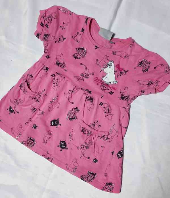Růžové šaty/tunika s kapsami, Moomin, vel. 100, délka cca 43 cm, šířka v pase cca 2x32 cm. 100% bavlna. Maličko vada tisku, ale neloupe se, viz foto.