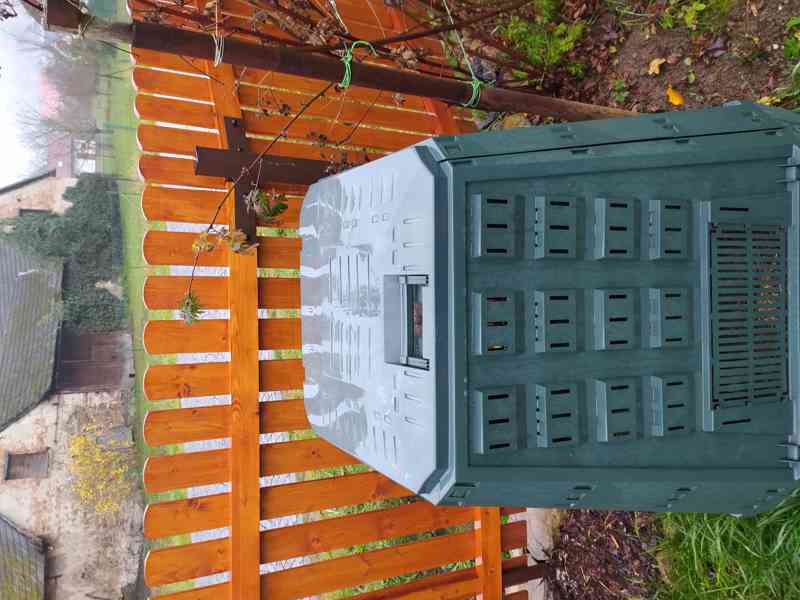 Nabízím zelený , nový , nepoužitý kompostér , objem 500 l , v dolní části šířka 82 cm . Běžná cena na trhu 1300 Kč , moje cena 700 Kč .