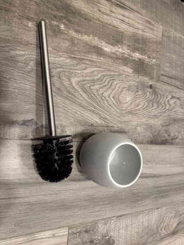 Prodám moderní WC štětku s keramickým stojánkem a kovovou rukojetí.