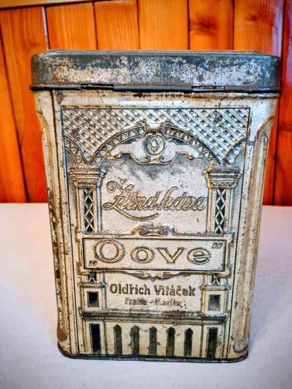 Starožitná plechovka Žitná káva-Oldřich Vitáček, Praha-Karlin. Zavírání funkční. Cca 18 x 18 x 26 cm. 350Kč.