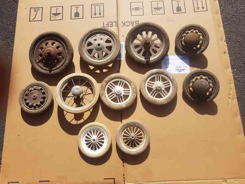 Prodám starožitná kovová a mladší plastová kolečka s gumou k retro dětským kočárkům. Rozměry dle čísel fotografií: č. 1) 2 kusy, průměr 18,5 - 19,0. č. 2) 1 ks bílé, průměr 22 cm. č. 3) 2 kusy, průměr 16 cm. č. 4) 4 kusy - žluté a červené, průměr 11,5 - 12,0. č. 5) 3 ks, průměr 18 cm. č.6) 2 ks různé, průměr obou 23 cm. č. 7) 1 ks, průměr 24 cm. Stav dle foto, i jednotlivě. Kovová kolečka cena za kus 80,- Kč, plastová cena za kus 25,- Kč. Možnost osobního předání na Praze 3, nebo odeslání přes Zásilkovnu. Volejte 770 630 523, nebo pište na morgiana007@gmail.com