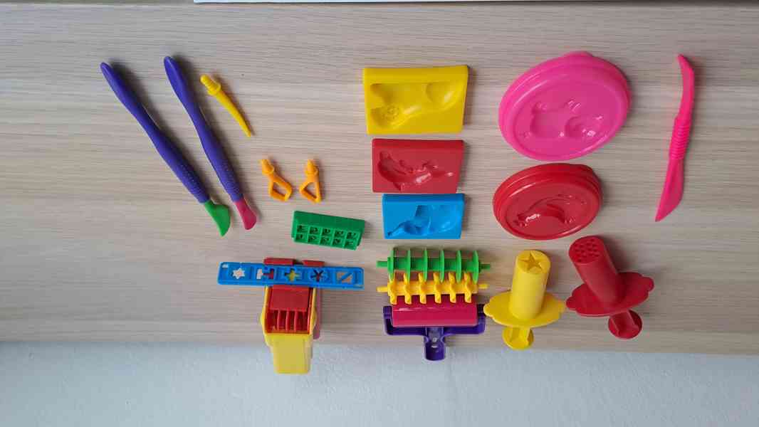 Pomůcky na hru s modelínou. Váleček se 3 nástavci, formičky apod.