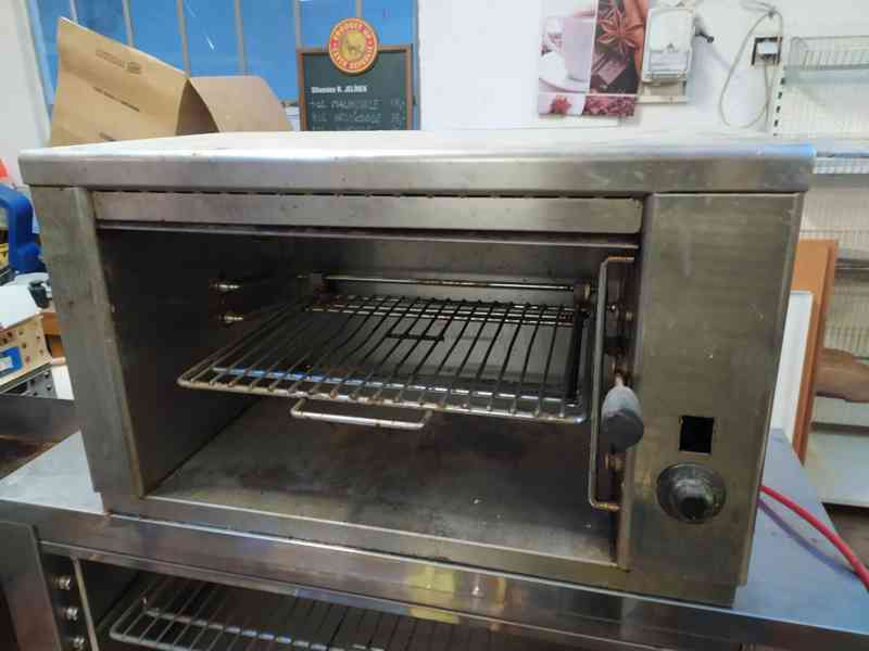 Salamander zapéká, ohřívá, udržuje, atd.; model SE 1-1 M, výkon 1,9 kW / 230 V. Rozměr celkový: 370 x 370 x 620 mm; rozměr roštu 300 x 390 mm; 4 nastavení výšky (7 cm / 10 cm / 14 cm / 18 cm); 3 nastavení teploty - ohřevu. Použitý, z malého bistra, funkční. Bazarová cena: 3.990,- Kč + doprava. (kód: 041120-01)