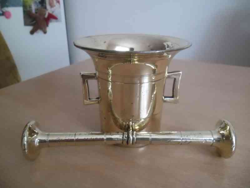 Prodám tento starý mosazný hmoždíř, zvenku jakž takž vyleštěn, uvnitř leštěn jen cca 4cm od horního okraje. Rozměry - výška hmoždíře 11,8cm, spodní průměr- 7,9cm, horní průměr-13cm a délka paličky je 22cm.Cena 650Kč + poštovné. V případě zájmu volejte na tel. 720 597 738. Koukněte i na moje ostatní inzeráty, více předmětů= jedno poštovné.