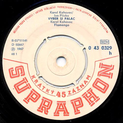 Prodám SP - Flamengo - Vyber si palác / Svou lásku jsem rozdal (Supraphon 0 43 0329, Vinyl, 7", 45 RPM, Repress, Mono, Czechoslovakia, Psychedelic Rock). Repress z roku 1968. (Manufacturing date code): 68 1. SP je ve velmi dobrém stavu. V případě zájmu převzetí v Praze nebo poštou + poštovné. Na dobírku nezasílám.