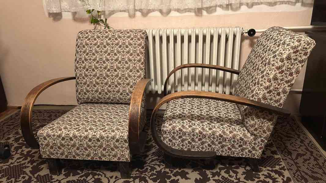 Sice stará, ale stále v pohodě použitelná nízká křesla. Čalounění je nové, opěradla jsou lehce ošoupaná, ale nijak to užívání nevadí, je to spíš stylová "patina". Pouze osobní odběr v Pardubicích.