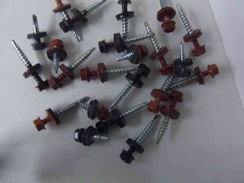 Prodám farmářské šrouby do dřeva s podložkou 4,8x35 a 4,8x20, černé, hnědé, šedé, stříbrné, cihlově červené a pozink, cena 1,50 Kč/ks , baleno po 250 ks