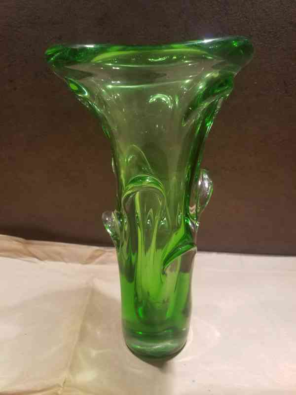 Prodám masivní zelenou hutní vázu s jádrem z výrazně barevného skla, které je navrstvené čirou a podjímané topasovou sklovinou a vytváří tzv. Sommerso efekt. Autor Jan Beránek, sklárna Ústředí uměleckých řemesel Škrdlovice po roce 1960. Výška 27 cm, průměr 15 cm v perfektním stavu. Osobní předání na Praze 3, nebo, pečlivě zabaleno, odeslání přes Zásilkovnu. Volejte 770 630 523, nebo pište na morgiana007@gmail.com