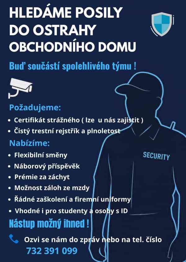 Jsme dlouhodobě zavedená bezpečnostní agentura, která poskytuje stabilní pracovní příležitosti. Hledáme nové kolegy na pozici strážných. Věříme, že poctivost a odpovědný přístup jsou klíčem k úspěchu a pokud sdílíte naše hodnoty, jste pro nás ideální kandidát.