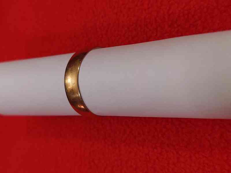 Zlatý prsten hladký. Hmotnost 3 gramy, puncováno. Šíře 6 mm, průměr návleku 21 mm.