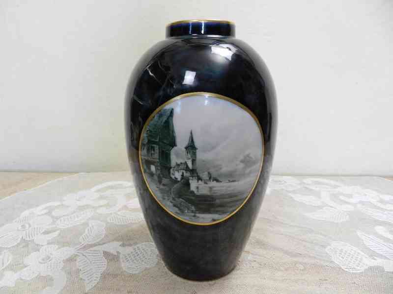 Krásná zlacená Váza s vedutou, barva tmavě zelená - Pirken Hammer, Březová, 1 pol. 20 stol.