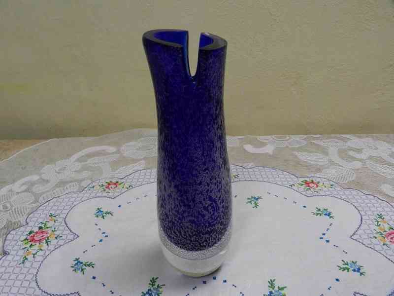 Zajímavá Autorská Váza, hutně tvarované sklo, barva modrá, 2 pol. 20 stol.