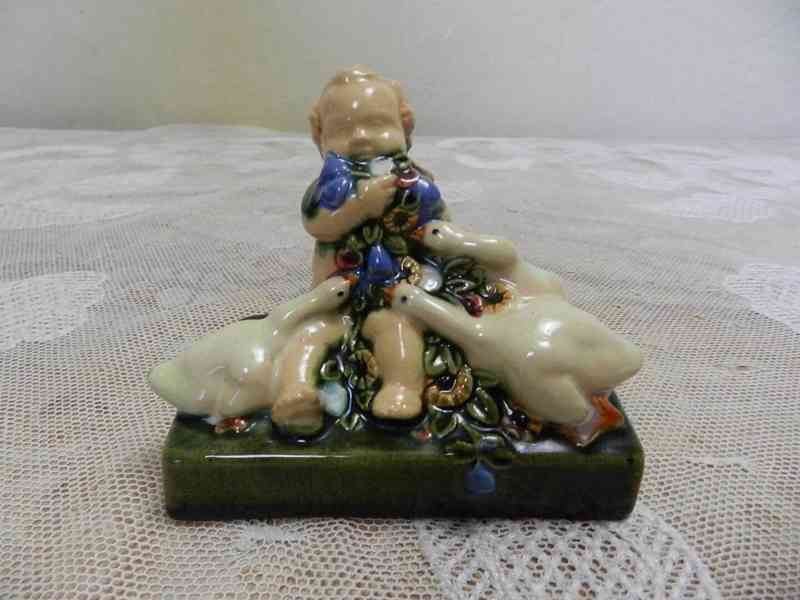 Zajímavá keramická soška Putti a Husy, glazovaná malovaná keramika, pěkné zpracování, značeno na zadní straně - jan Lichtág, podle figurek od Powolnyho, V.D.K. Bechyně, kolem 1920.