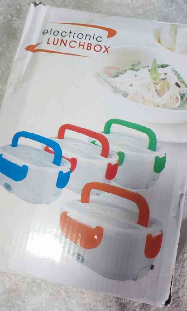 Ohřívací box na oběd, modro bílá barva, kapacita 1,05 litru, výkon 40w, napětí 12v. Nové, nepoužité. K dispozici 2 ks.