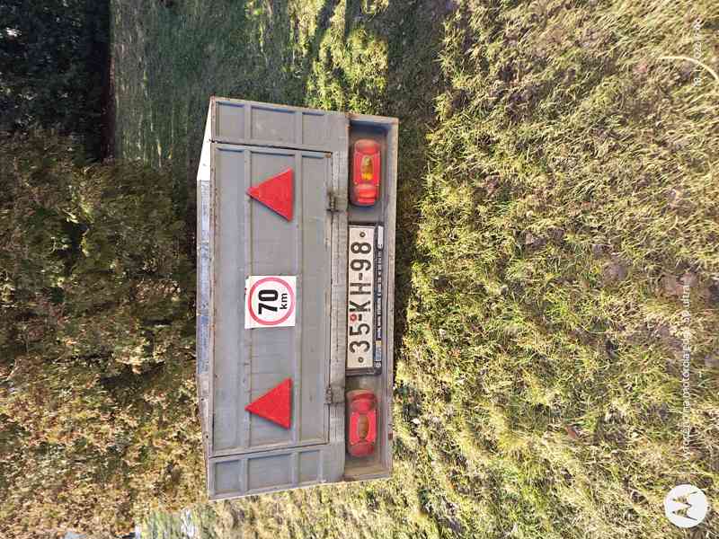 Přívěsný vozík za auto, zcela funkční, STK do 6/2028. Pevná kovová konstrukce, vyklápěcí zadní sajtna, silná deska s hydroizolační úpravou. Úložný prostor 160x120x40sajtna. Náhradní pneu. Brandýs nad Labem.
