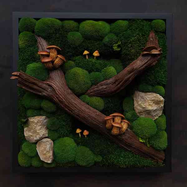 Obrazy jsou ručně vyrobené ze stabilizovaného mechu, rostlin a sušených hub tzn, že jsou bezúdržbové.