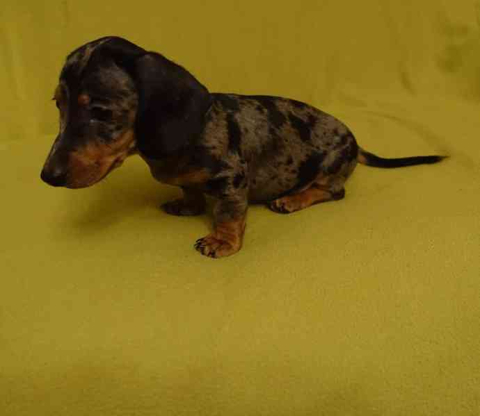 Prodám štěňata jezevčík trpasličí ,krátkosrstý bez PP,barva černá merle,rodiče možno vidět na místě,více informací na tel.736643045.