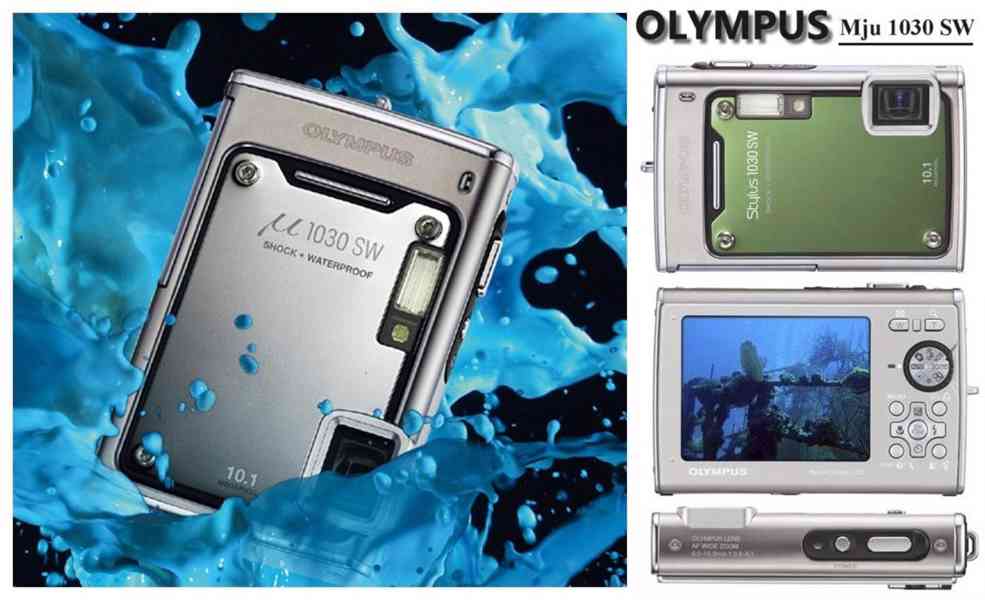 Olympus µ [mju:] 1030 SW je vodotěsný do hloubky až 10 m, odolný proti pádům z výšky až 2 m a tlaku až 100 kg. Rozlišení 10 Mpx, širokoúhlý objektiv s 3,6x optickým zoomem, ISO 80-1600, LCD 2,7 palce, 173 g.