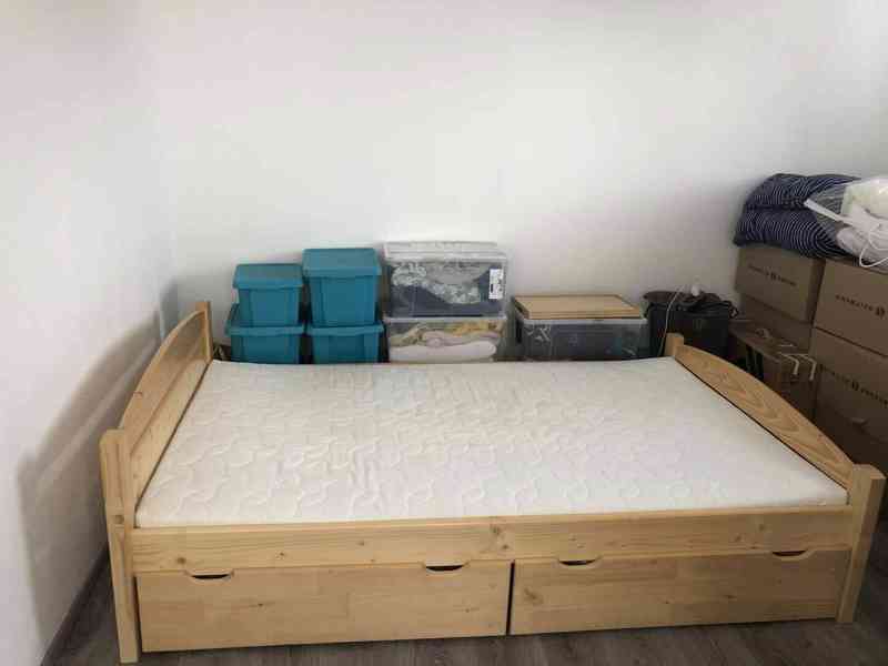 Z důvodu stěhování a koupě jiné větší postele, prodám postel z masivu smrk s rozměry 209x134 cm pro matraci 200x120cm vč. úložných prostorů, pěnové matrace a laťkového roštu. Používané 3 roky. Pořizovací cena činila 12 738,-Kč.