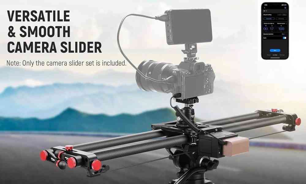 Všestranný a plynulý posuvník kamery: Tento 80 cm dlouhý posuvník kamery automaticky posouvá kameru tam a zpět pro profesionální nahrávání videa. Maximální nosnost je 5 kg v horizontální poloze a 2,5 kg v naklonění o 45°.