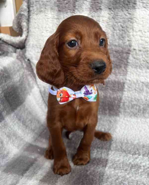 Naše úžasná fenka Prue dala na svět nejúžasnější vrh štěňat. Tato štěňata jsou zdravá, šťastná, skákavá a zábavná a nyní připravená na věčné a milující domovy. Oba rodiče jsou DNA dědičně prostí všech zdravotních problémů plemene iris setr. Štěňata od nás odcházejí s registračním dokladem kc. Veterinárním dokladem o zdravotním stavu, plně očkovaná. Pokyny k přenosu mikročipu. Kupní smlouva. 3 kg vlastního krmiva pro štěňata a třicetiprocentní sleva na další balení. Jakožto licencovaní chovatelé jsme vám vždy k dispozici pro rady ohledně následné péče.