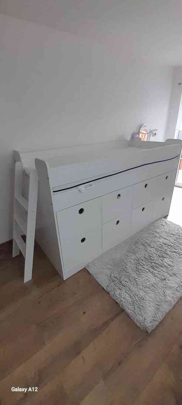 Prodám krásnou vyvýšenou bílou postel. Rozměry v obrázku, odvoz vlastní.