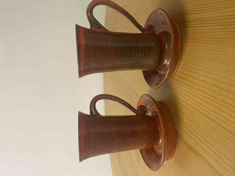 Nabízím sadu dvou originálních keramických hrníčků včetně podšálků. Ručně točená keramika, glazovaná do hnědo-červených odstínů. Vhodné na kávu, čaj nebo jako pěkná dekorace.