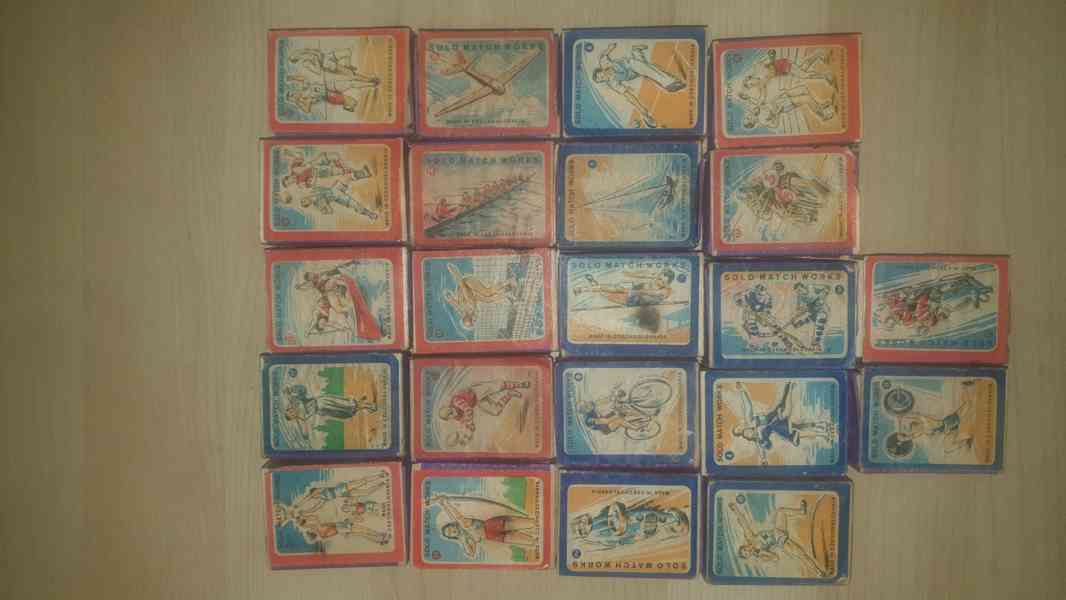 Staré dýhované krabičky bez zápalek. Jedna krabička bez vnitřku.