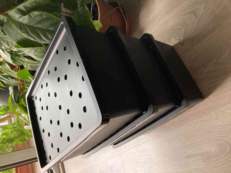 Dna chovných nádob jsou perforovaná - žížaly se mezi nima můžou svobodně pohybovat. Až budete mít jedno patro plné, nadstavíte si nad něj další, do kterého si žížaly časem sami přelezou.