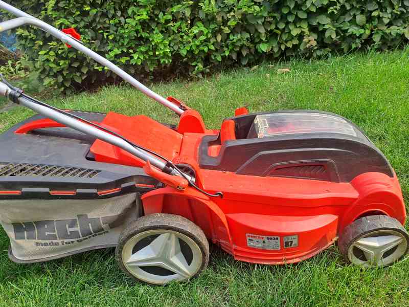 HECHT 5038 + 1 ks baterie 5 Ah + 1 ks nabíječka. Záběr 38 cm, 5 výškových stupňů, nastavitelná rukojeť, málo používaná. Cena 1 900 Kč, Praha, Beroun, Kutná Hora, tel.: 734 573 876