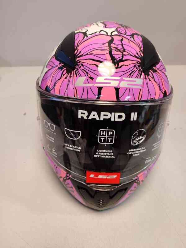 Silniční přilba od značky LS2 model Rapid Poppies ve velikosti – XS. Je nová a nepoužitá. Vysoká míra ochrany a moderní design, vynikající poměr kvality a ceny, skořepina z HPTT kompozitu, UV-odolné plexi s úpravou proti poškrábání, větrání Dynamic Flow-through Ventilation, vyjímatelný a pratelný interiér, nosní deflektor, zapínání mikropřezkou, rychloupínací, odolný proti UV záření, odolný proti poškrábání a připravený pro Pinlock, vnitřní podšívka odnímatelná omyvatelná a prodyšná, laserem řezaná pěna, zesílený podbradní pásek, EPS s více hustotami, polstrování krku.