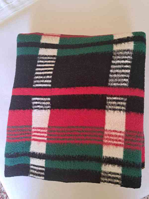 BAREVNÁ:Středně silná, barevná deka s chlupem (odlišný líc a rub), rozměry 190 cm x 150 cm. Obroubená. Vhodná jako přikrývka, na piknik, pro děti na sezení na zemi, atd. Málo užívaná. Cena: 250 Kč.