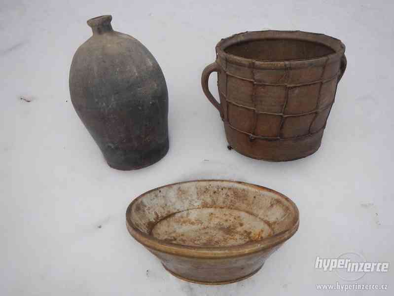 proutěný kočár 1.000,- , hliněné nádoby 850,-/ks, konev na mléko 550,-