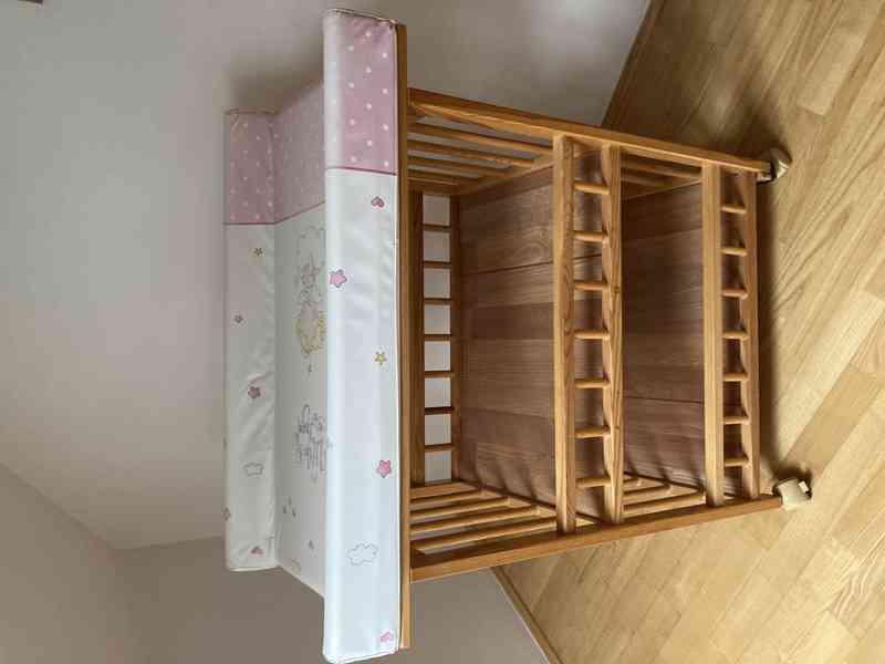 Dětská postýlka z lakovaného dřeva, zánovní, drobné vady po dětech. Cena je i s matrací 120 x 60cm.