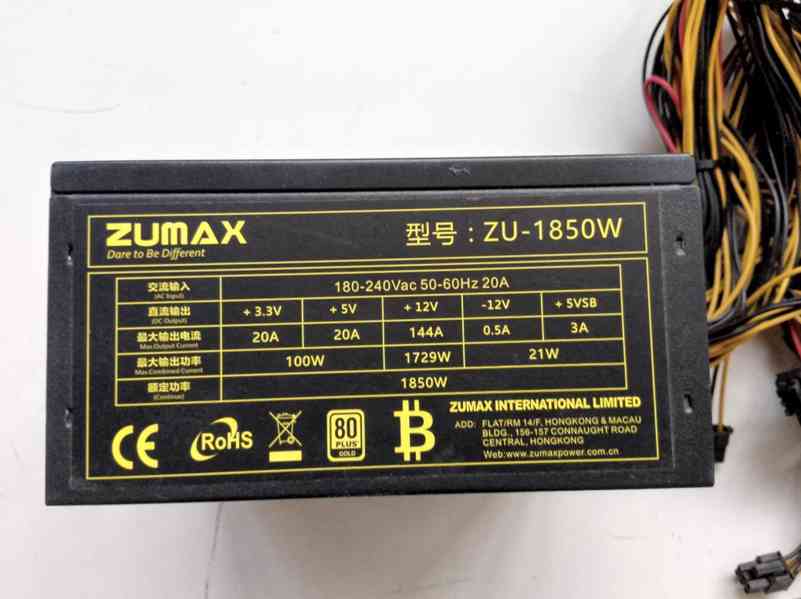 Prodám napájecí zdroj Zumax ZU-1850W Pro, výkon 1850 W, formát ATX, aktivní PFC, účinnost až 90 %, vstupní napětí 180–260V, vybaven 14cm chladicím ventilátorem, konektory 24-pin ATX, CPU 4+4 pin, PCI-E 6+2 pin, SATA a Molex, ochrany OVP/UVP/OPP/SCP, vhodný pro herní PC, pracovní stanice a mining. V profilu mám více inzerátů, mohu zaslat poštou nebo osobní převzetí na adrese Rostovska 260/2b.