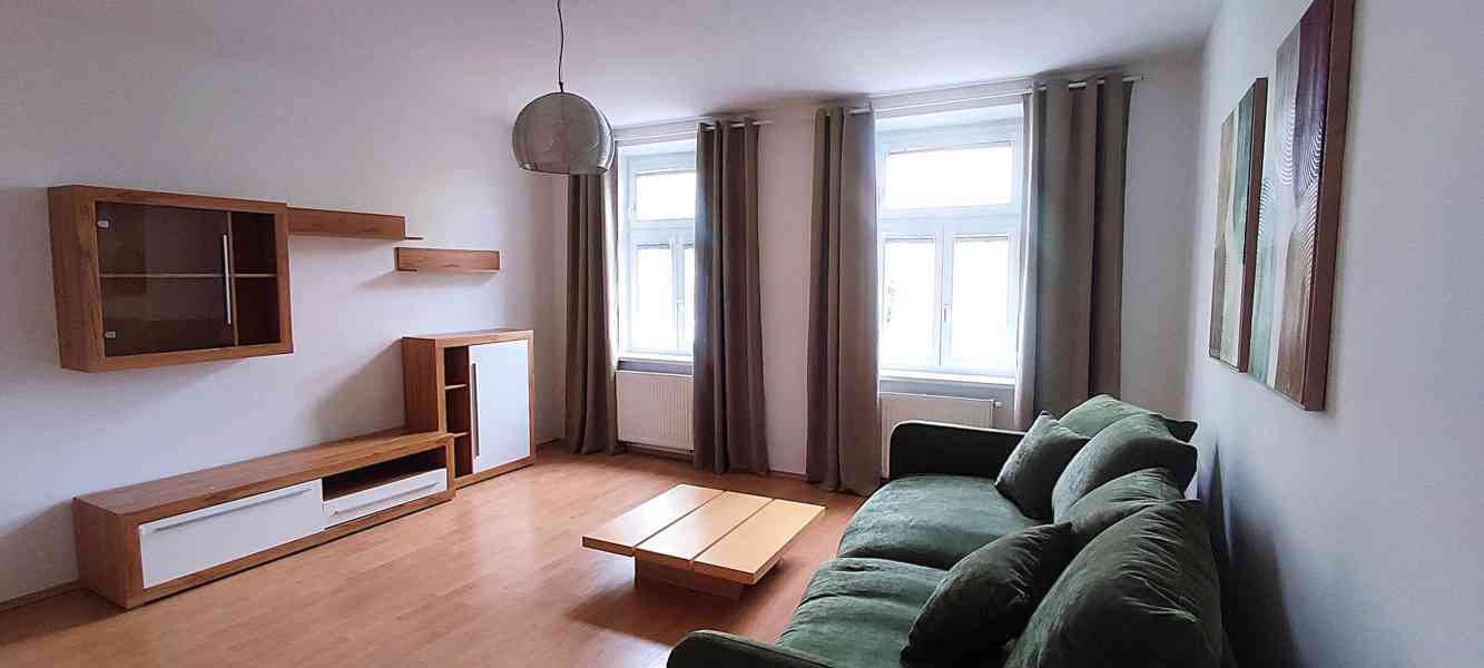 Dispozice: prostorný obývací pokoj (cca 30 m²) s výhledem do ulice, ložnice a kuchyně s okny do klidného, zatravněného vnitrobloku.