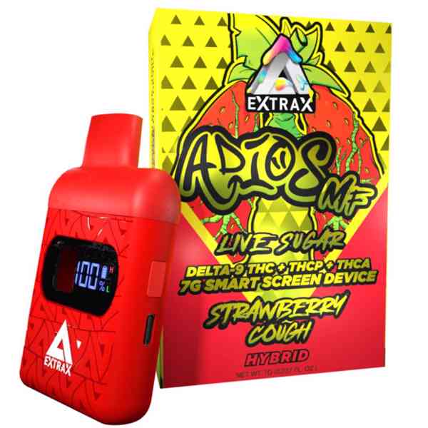 Enjoy the Delta Extrax Adios MF Disposable, featuring a smart LED display and a live sugar infusion blend of Delta-9, THC-P, THC-A Live Sugar, and Delta-8 cannabinoids