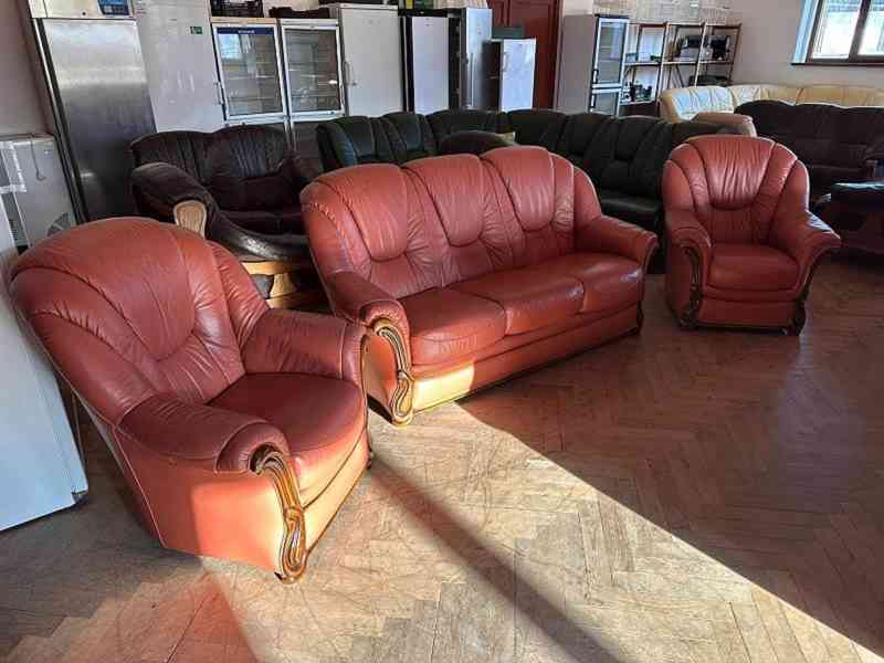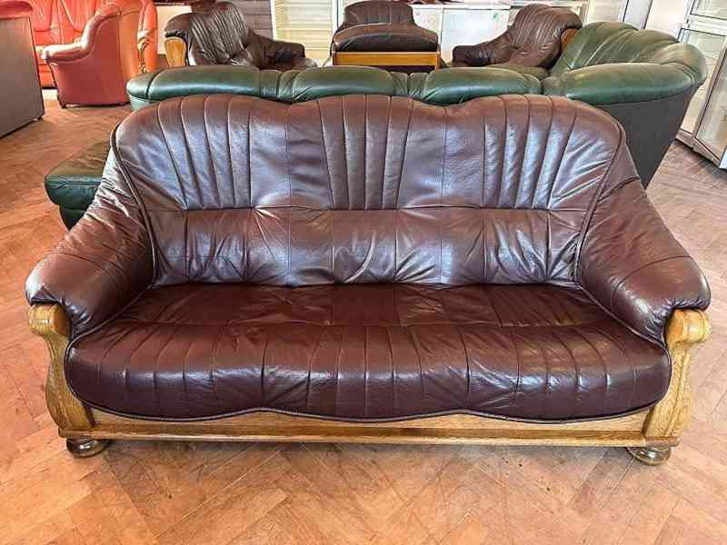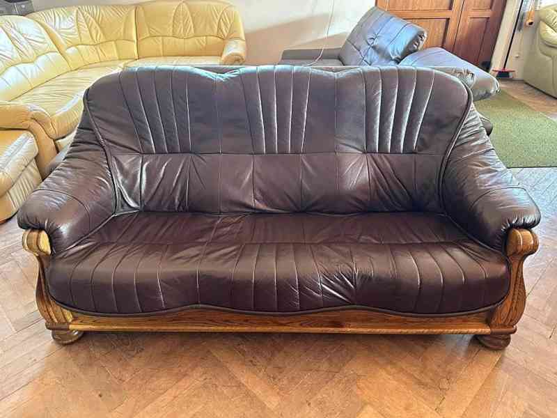 Pravá kůže v kombinaci s ozdobným frézovaným dřevem - tvrdé dřevo - masiv. Vhodná i k umístění do prostoru - vzadu dřevo, kůže, látka. Snadná manipulace – sedací části lze vyjmout. Vysoká sedačka. Pravá kůže. Barva tmavě hnědá.