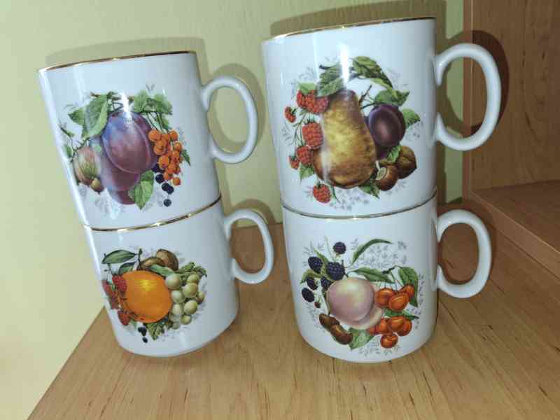Retro čajové hrnky se zlatým okrajem a motivy ovoce - 4 kusy (u jednoho menší odštěp u hor. okraje, výška i průměr 8 cm). Dětský hrneček (1 ks) - menší (7 cm výška i průměr), s roztomilými motivy po obou stranách