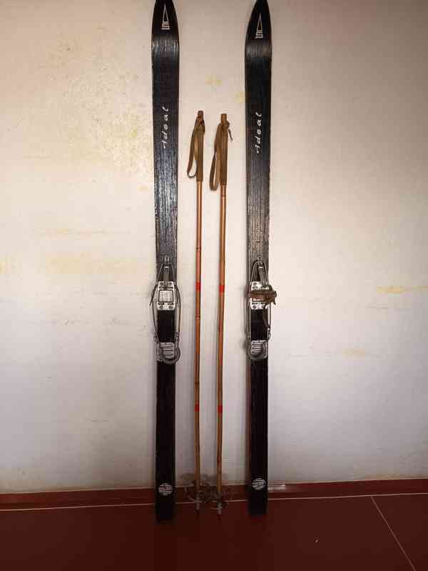 Prodám starožitné dřevěné lyže, délka 160 cm a bambusové hůlky, délka 125 cm