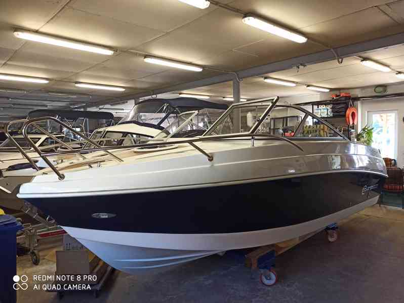 Výbava Standard, barevný pás na trupu (ocelově modrá), barevná konzole řízení (jet black), Vendeck, kajutové matrace Noble Lux dark brown/ macciato, křeslo řidiče Sunset jednobarevné, kokpitové matrace dvoubarevné Sunset/Meteor piké, skládací kabrio Dark Blue, převozní potah Dark Blue, lukna, příďová kotevní rolna, LED osvětlení kokpitu, klakson vestavný, přepojovač akumulátoru, lednice 30l, tlakový rozvod vody-56l nádrž+sprcha+dřez+čerpadlo, HPL Teak na podlaze - napodobenina, HPL teak stůl s nohou, koupací záďové platformy, nerezová konstrukce lyžaře, Mercury F 150 L PRO XS
