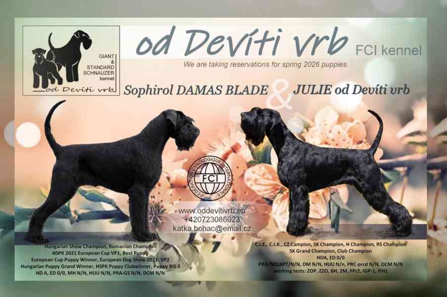 Štěňátka k rezervaci - štěňátka velkého černého knírače s předpokladem krásného exteriéru a chutí pro sport i různé aktivity. Oba rodiče jsou mezinárodní výstavní šampioni, s několika pracovními zkouškami a přitom povahově vyrovnaní, žijící v rodině s dětmi. Oba mají negativní dysplazii kyčelních i loketních kloubů a genetické testy. Štěňátka jsou odchovávaná v rodině, k odběru koncem 05/2026. Lokalita Brno.