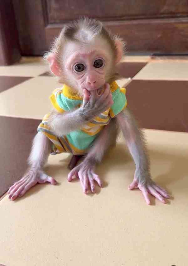 Tato opička, vychovaná s láskou a péčí, je dobře socializovaná a užívá si hraní i mazlení. Její výrazné oči a okouzlující osobnost ji činí skutečně neodolatelnou. Tato opička s copánkem je ideální pro zodpovědné a milující domovy a je připravena do vašeho života vnést radost, teplo a nekonečnou zábavu.