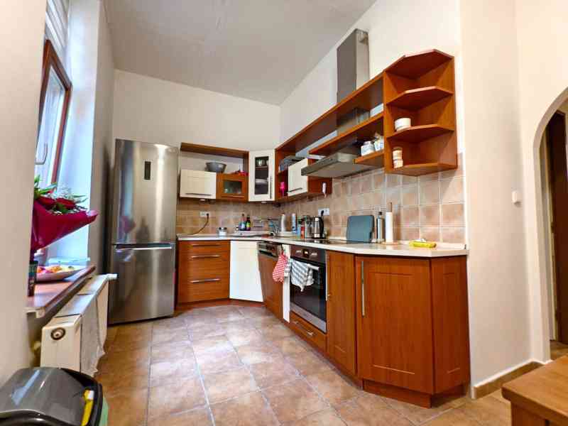 V kuchyni bytu najdeme VELKOU KUCHYŇSKOU LINKU s vestavěným elektrickým SPORÁKEM, MYČKOU a prostorem pro pračku!