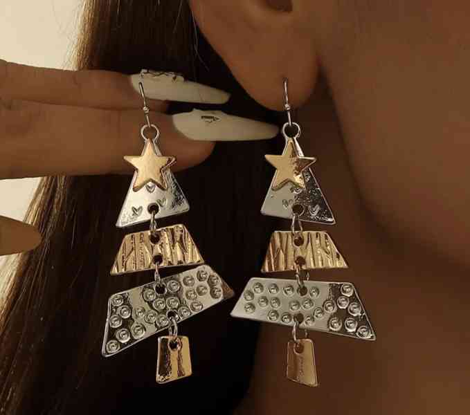 Jedinečné visací náušnice inspirované kouzlem Vánoc - elegantní kombinace zlatých a stříbrných tónů v geometrickém designu, který připomíná stylizovaný vánoční stromeček. Každý detail je promyšlený - hvězda na vrcholu, texturované trojúhelníky a jemné obdélníkové přívěsky vytvářejí harmonii tvarů a lesku.