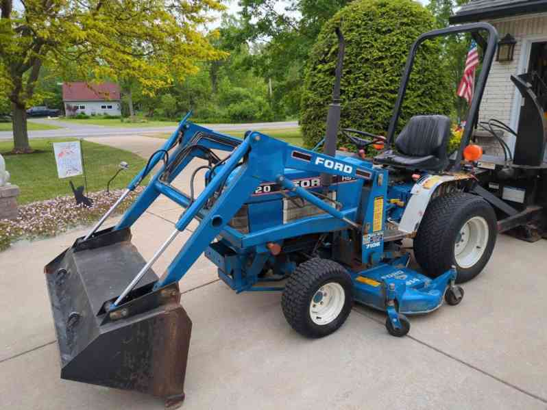 Traktor Ford 1220 HST z roku 1992 s nakladačem a spodní sekačkou.