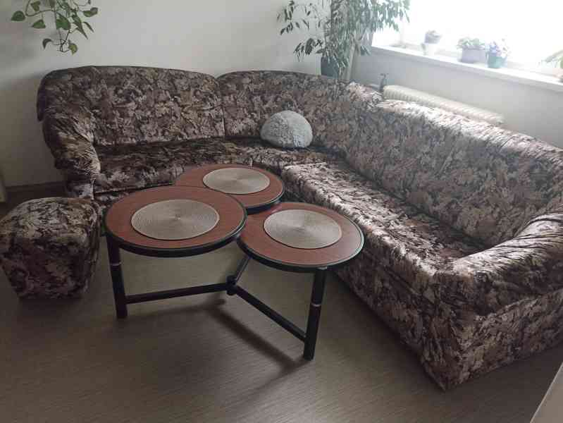 Rohová sedačka rozkládací s úložným prostorem a taburetem. Rozměry cca 2,30 x 2,60
